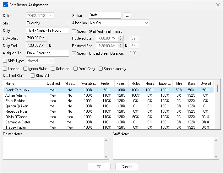 Information is shown for each staff member to indicate whether they can be assigned to this duty - the list is automatically sorted so that the best candidates are at the top in descending order of overall suitability.